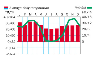 On distingue deux saisons humides (février-mai, grande saison des pluies et septembre-décembre, petite saison des pluies) et deux saisons sèches (mai-septembre, grande saison sèche et décembre-janvier, petite saison sèche).